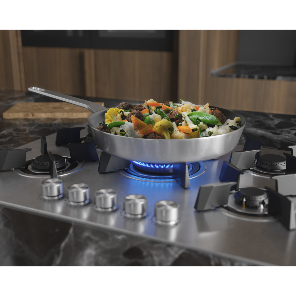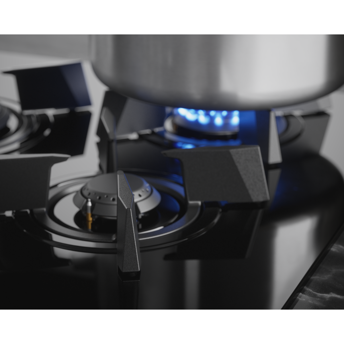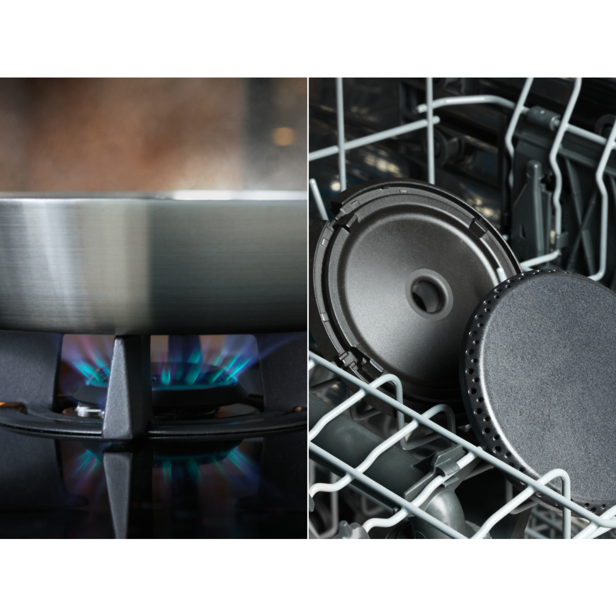 Os queimadores em preto mate podem ser lavados na máquina de lavar loiça e permitem poupar até 20% de energia, aquecendo mais rapidamente. A chama vertical, mais precisa, aquece apenas o recipiente em utilização, garantindo maior eficiência.