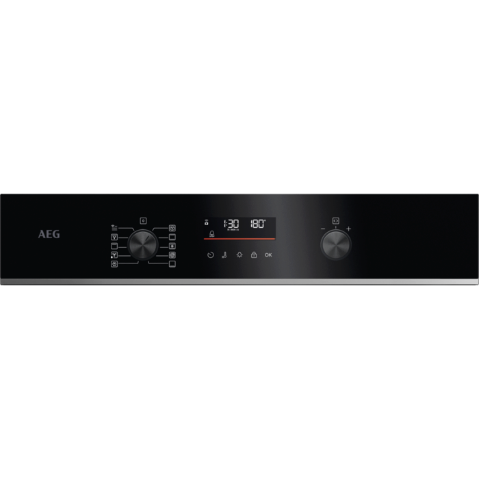 Forno pirolítico multifunções da Série 5000 SurroundCook com Display LED Explore e WiFi, de 72 litros, 9 funções e 45 programas automáticos, comandos escamoteáveis, calhas telescópicas num nível, porta com 4 vidros, vidro preto com perfil Inox Infinity e puxador preto anodizado