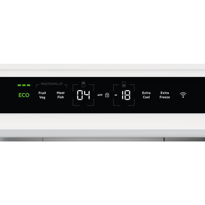 Combinado da Série 9000 MultiChill 0°, com 177,2 cm x 55,7 cm, com tecnologia TwinTech Total No Frost, barra Multiflow em vidro, display digital com Ecometer, gaveta GreenZone+, congelador convertível em frigorífico, compressor Inverter, interiores fabricados com materiais reciclados, iluminação LED e instalação rápida.