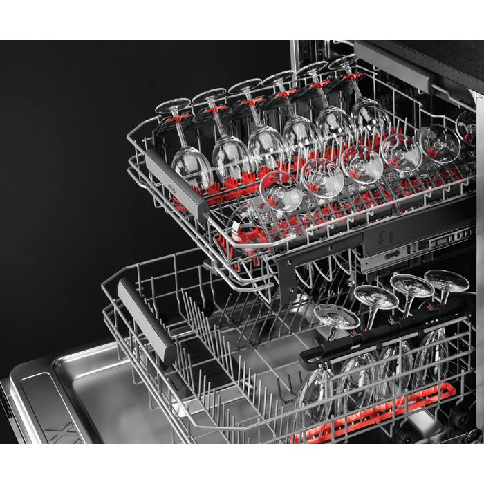 Máquina de lavar loiça de painel à vista de 60cm com capacidade para 13 talheres, com 9 programas a 4 temperaturas, 5 níveis de aspersão com Braço Satélite, Soft Grips e SoftSpikes para cuidado superior de copos delicados, sistema de secagem AirDry, motor Inverter, instalação porta deslizante, nível de ruído 49 dB(A)