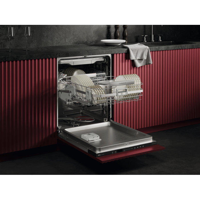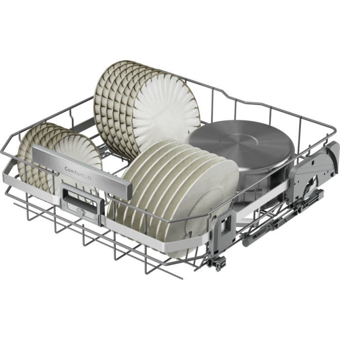 Máquina de lavar loiça de encastre ComfortLift de 60 cm da Série 8000 CleaningPerformance para 14 talheres, SmartSelect Conectaded, display TFT com Ecometer, 3.º tabuleiro EasyFlex+, braço aspersor Satellite Pro, zona ZoneClean de limpeza intensiva, função ExtraSilent 38 dB(A), TimeBeam (projeta o tempo restante no chão), iluminação interior, porta deslizante