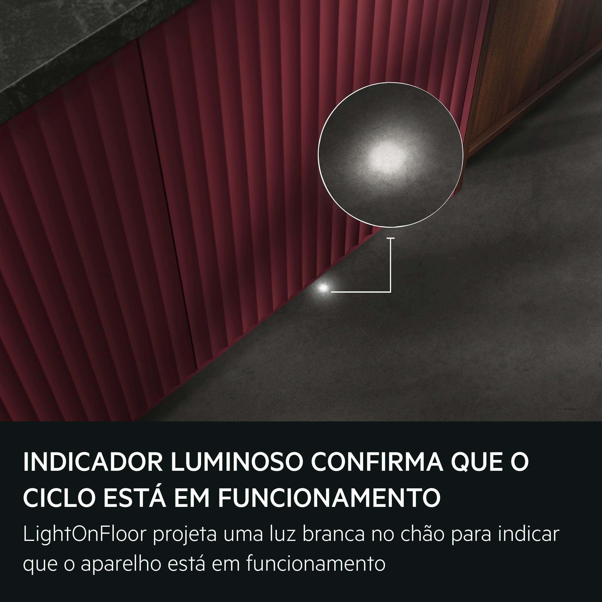 Uma luz branca é projetada no chão quando o ciclo de lavagem está em curso