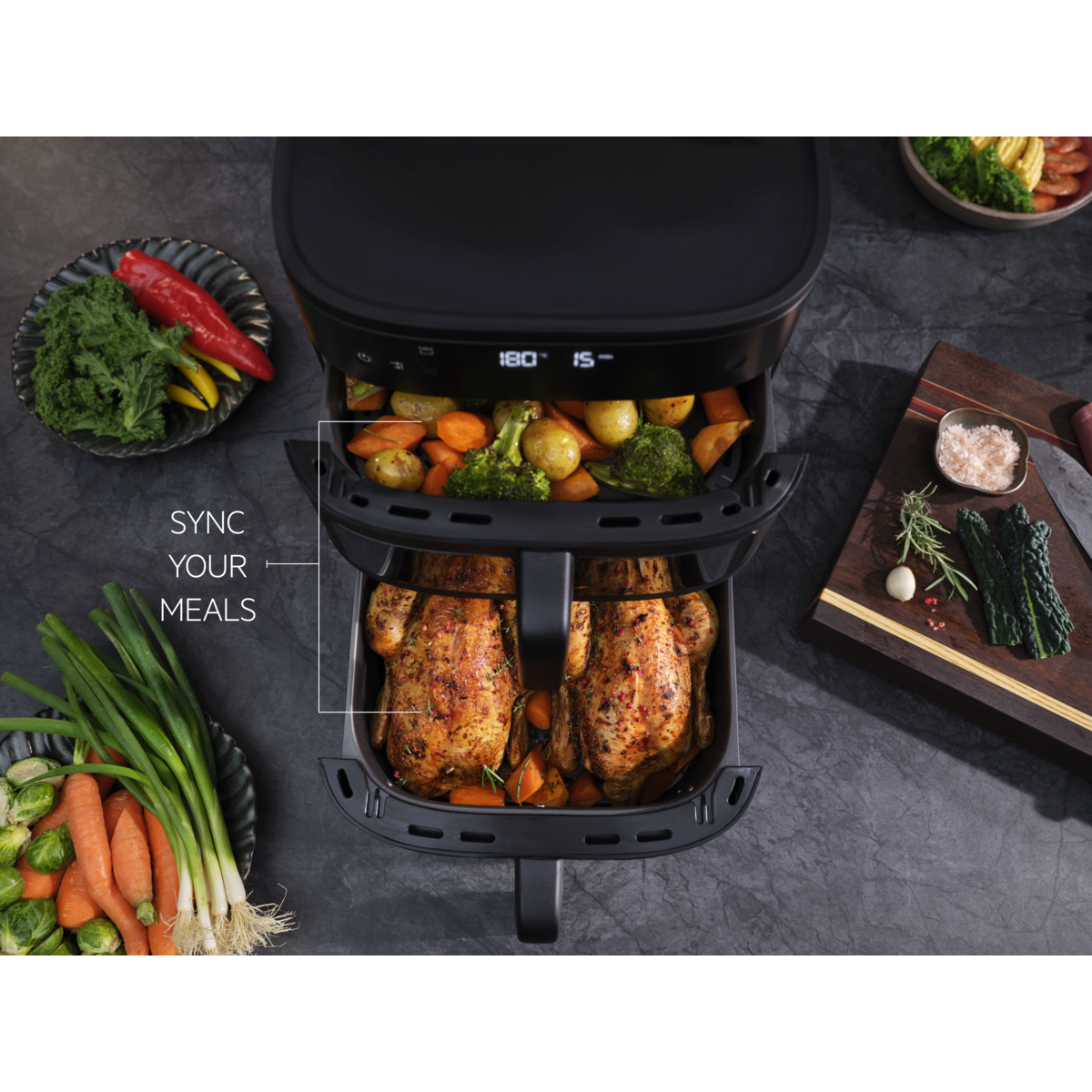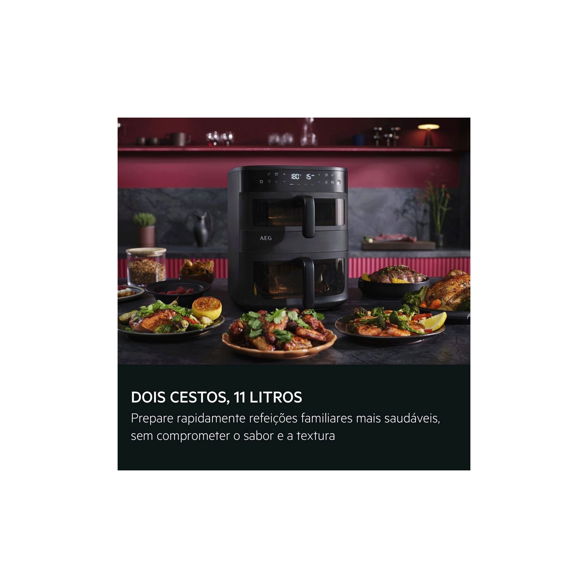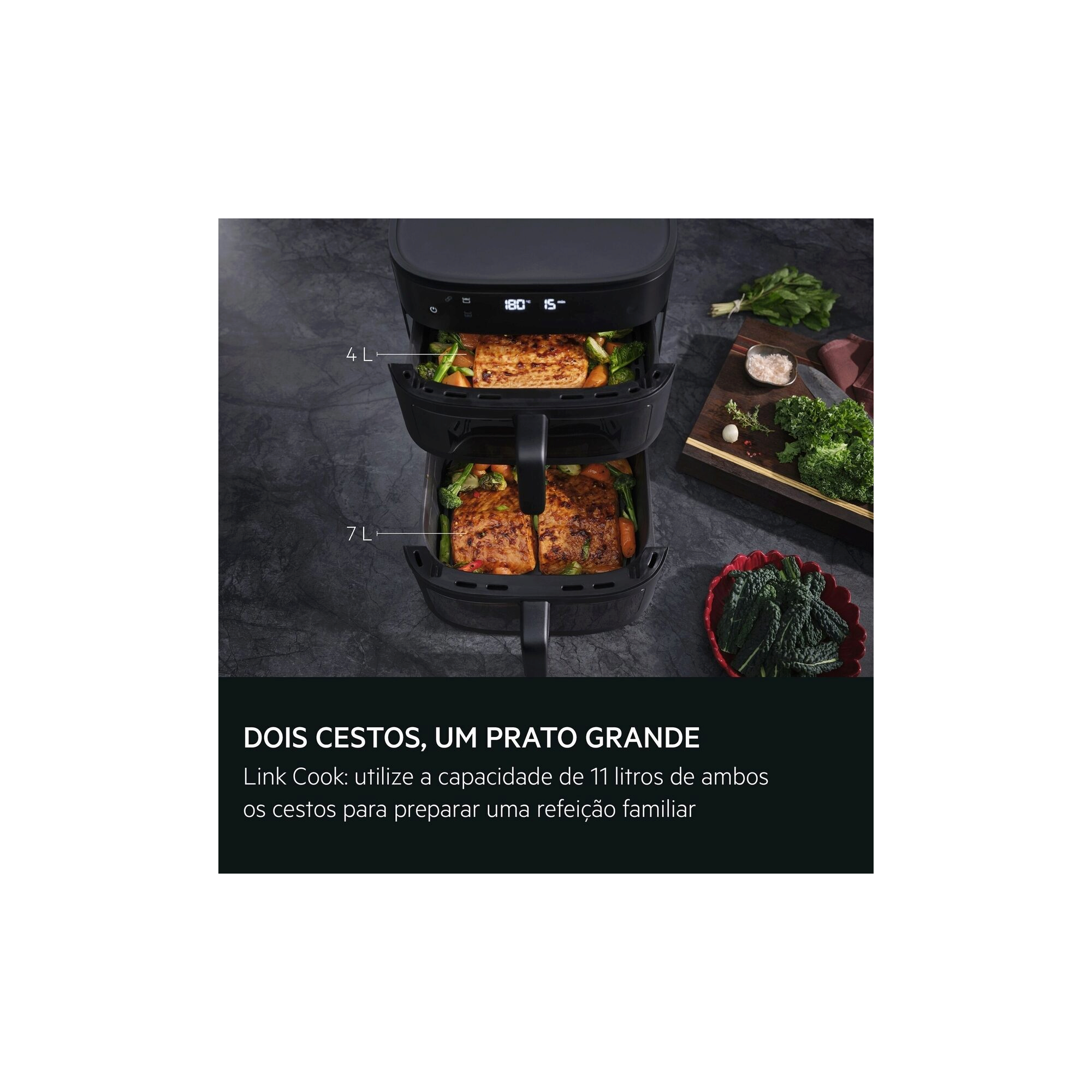Mais capacidade, sem comprometer o desempenho. Preparar uma refeição saudável rapidamente para toda a família nunca foi tão fácil. O sistema de duas cestas permite cozinhar refeições familiares sem sacrificar o sabor ou a textura.