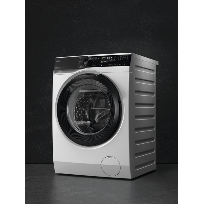 Máquina de lavar roupa AEG da Série 7000 ProSteam de 9 kg e 1.400 rpm, painel de controlo preto e porta preta, motor Inverter, tecnologia AutoDose que calcula a dose certa de detergente e amaciador e tecnologia ProSense que poupa tempo, água e energia, com tambor Care