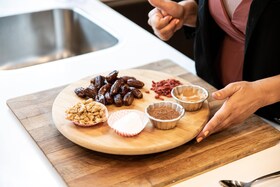2. Cortar as nozes em pedaços pequenos (as nozes são opcionais, mas dão um crocante às trufas) e misturar juntamente com a pasta de tâmaras e cacau.