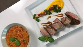 Ingredientes: 200g tomate cherry; Azeite q.b.; 100g cebola; Mangericão; 100g farinha de milho; 100g água; Sal q.b.; 1 cenoura, alho vinagre e pimentão; 1 posta de barriga de atum rabilho