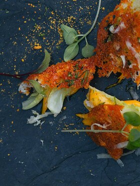 Para terminar a salada, separe as folhas da alface e coloque-as numa travessa, salpique-as com o molho, coloque uma fatia de pão por cima e termine com raspas de queijo Paipa.