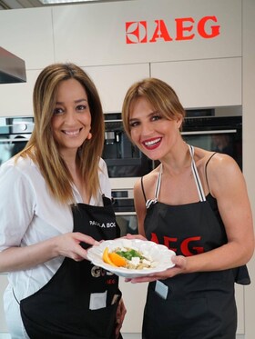 Utilizámos, claro, o Fusion Wok da AEG. Porquê? Porque permite saltear com as vantagens da cozedura wok, com a velocidade, a eficiência energética e controlo perfeito de temperatura associado à tecnologia de indução. Demorou tudo 6 minutos. Dá para acreditar? E o anel de suporte é perfeito! Assim que acabamos de cozinhar, podemos pegar imediatamente no wok, assente neste anel, e levar diretamente para a mesa.