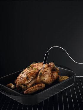 Um forno com sonda térmica permite-lhe saber o ponto exato de cozedura dos seus alimentos. No caso das carnes mais exigentes, esse ponto situa-se entre 45ºC e 70ºC (dependendo do ponto desejado da carne), enquanto que a temperatura indicada para cozinhar frango ou peru ronda os 80ºC. O peixe, por outro lado, requer uma temperatura mais baixa de cerca de 60ºC.