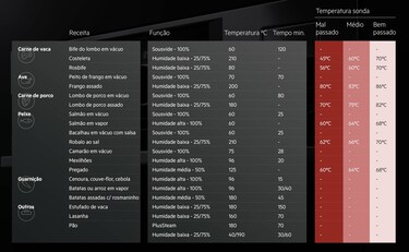 Tabelas de temperatura para cozinhar com o forno a vapor