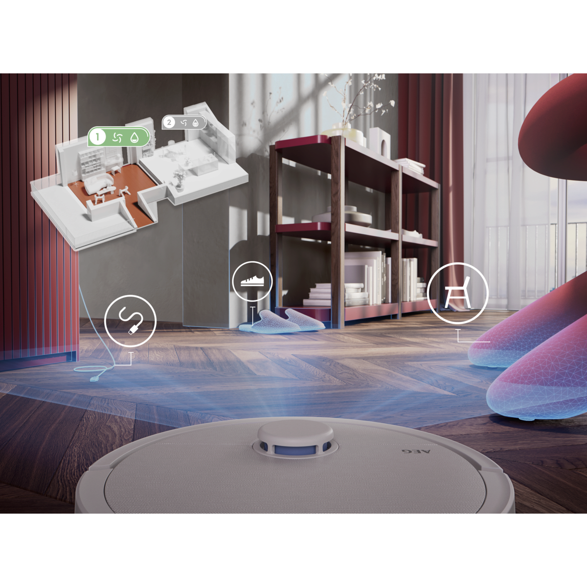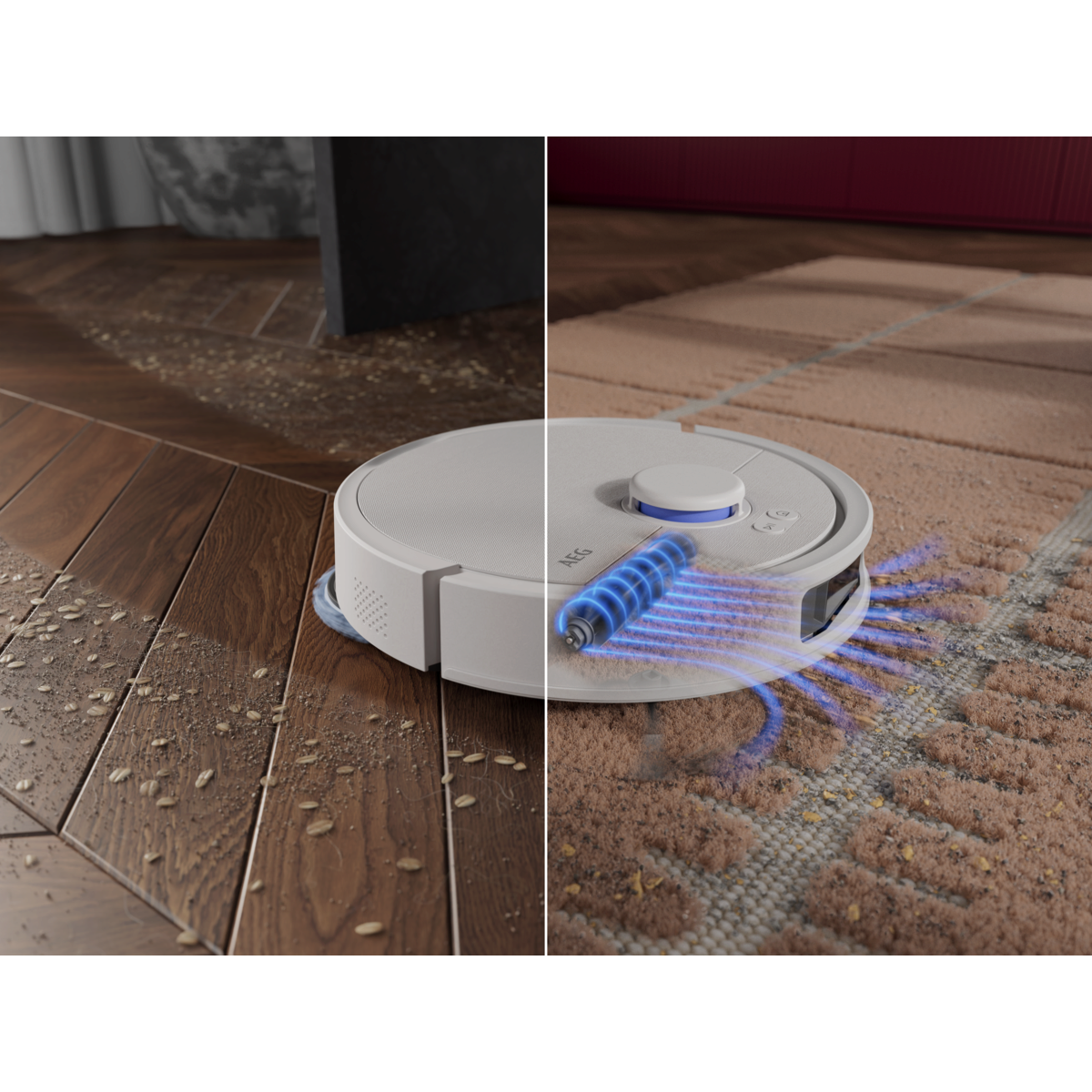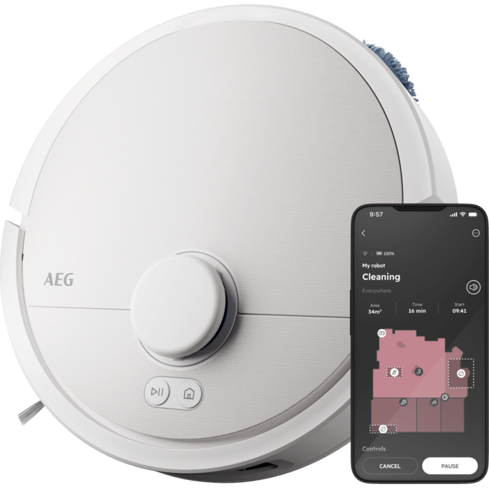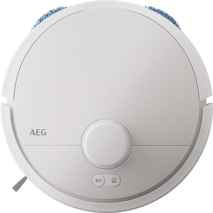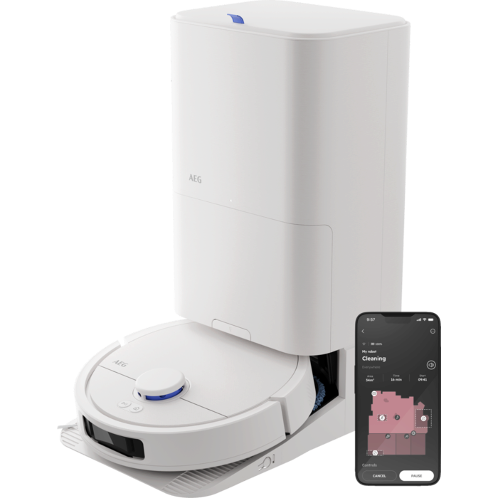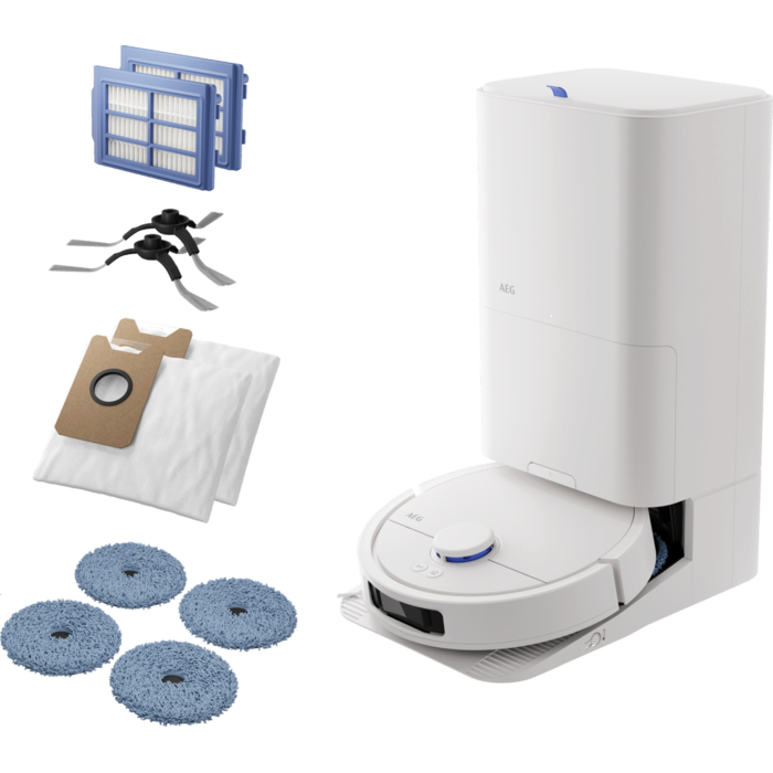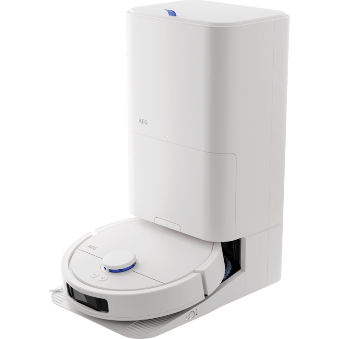 Aspirador robot AEG Trilobite com tecnologia Laser LiDAR, limpeza por zonas, função mopa, tempo de carregamento inferior a 6 horas, autonomia máxima de 208 minutos, potência de 7000 Pa, depósito de pó de 0,3 litros, depósito de água de 0,1 litros, app iOS e Android, controlo por voz, escova principal motorizada, base de carregamento e estação de esvaziamento com função de secagem a 60–65 °C, saco da estação com capacidade de 2,5 litros e reservatório de água de 3,2 litros, branco