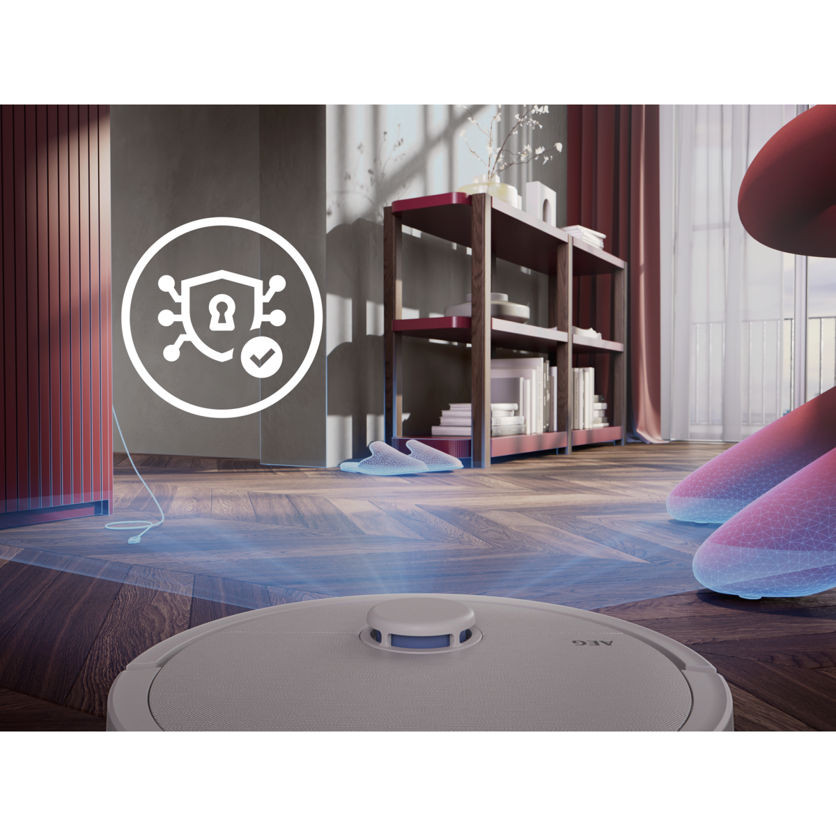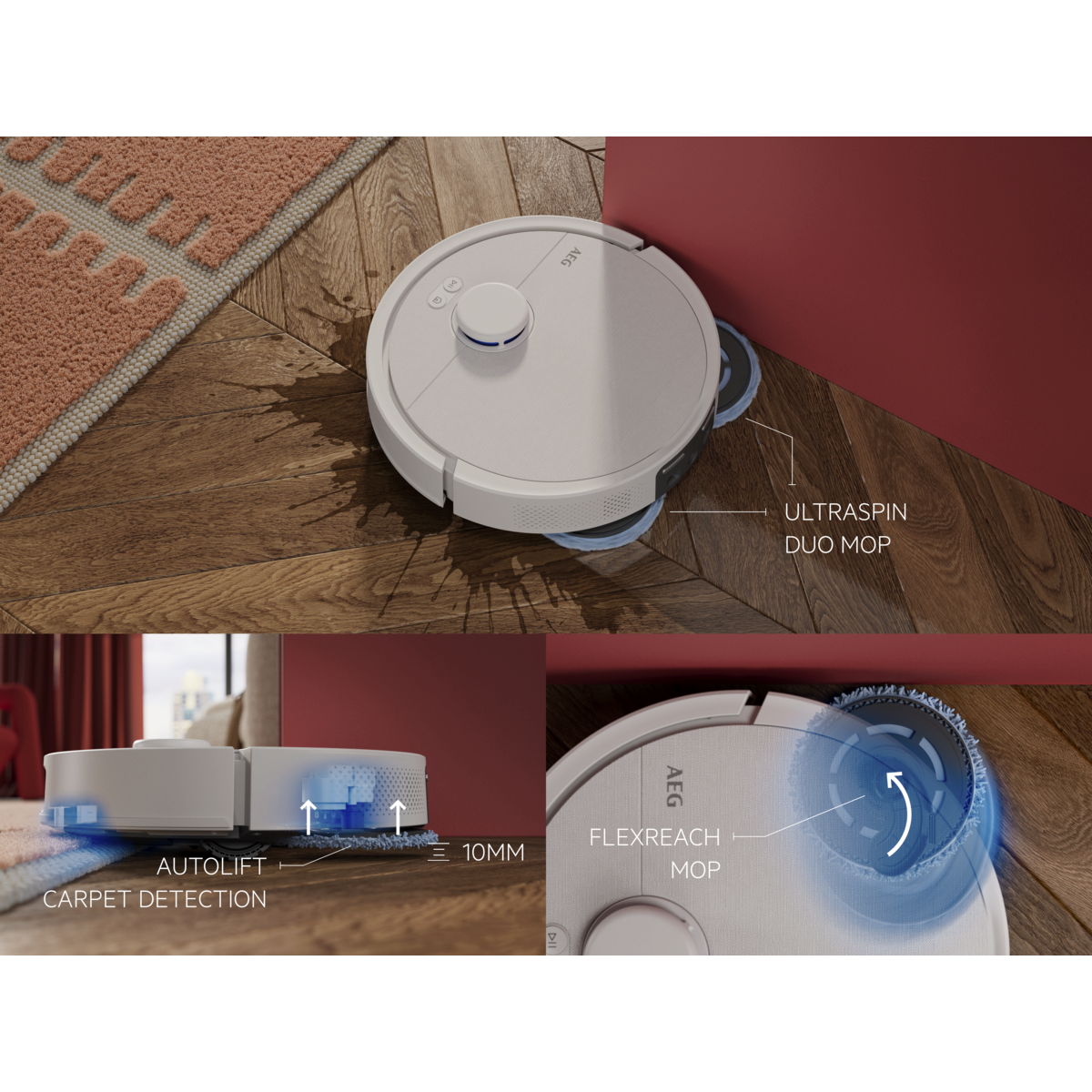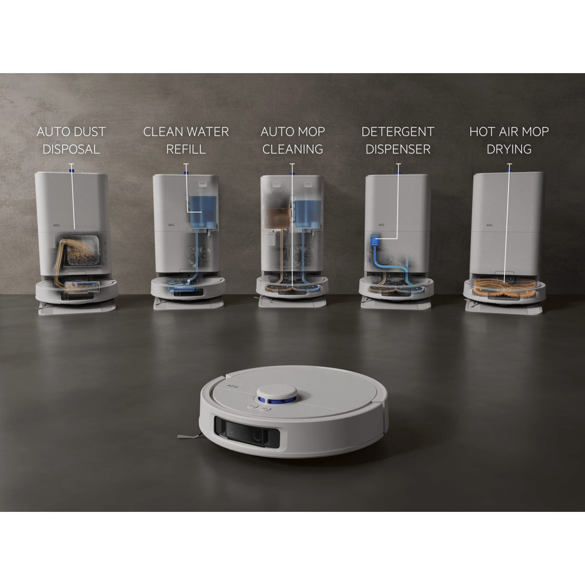 Aspirador robot AEG Trilobite com tecnologia Laser LiDAR, limpeza por zonas, função mopa, tempo de carregamento inferior a 6 horas, autonomia máxima de 208 minutos, potência de 7000 Pa, depósito de pó de 0,3 litros, depósito de água de 0,1 litros, app iOS e Android, controlo por voz, escova principal motorizada, base de carregamento e estação de esvaziamento com função de secagem a 60–65 °C, saco da estação com capacidade de 2,5 litros e reservatório de água de 3,2 litros, branco