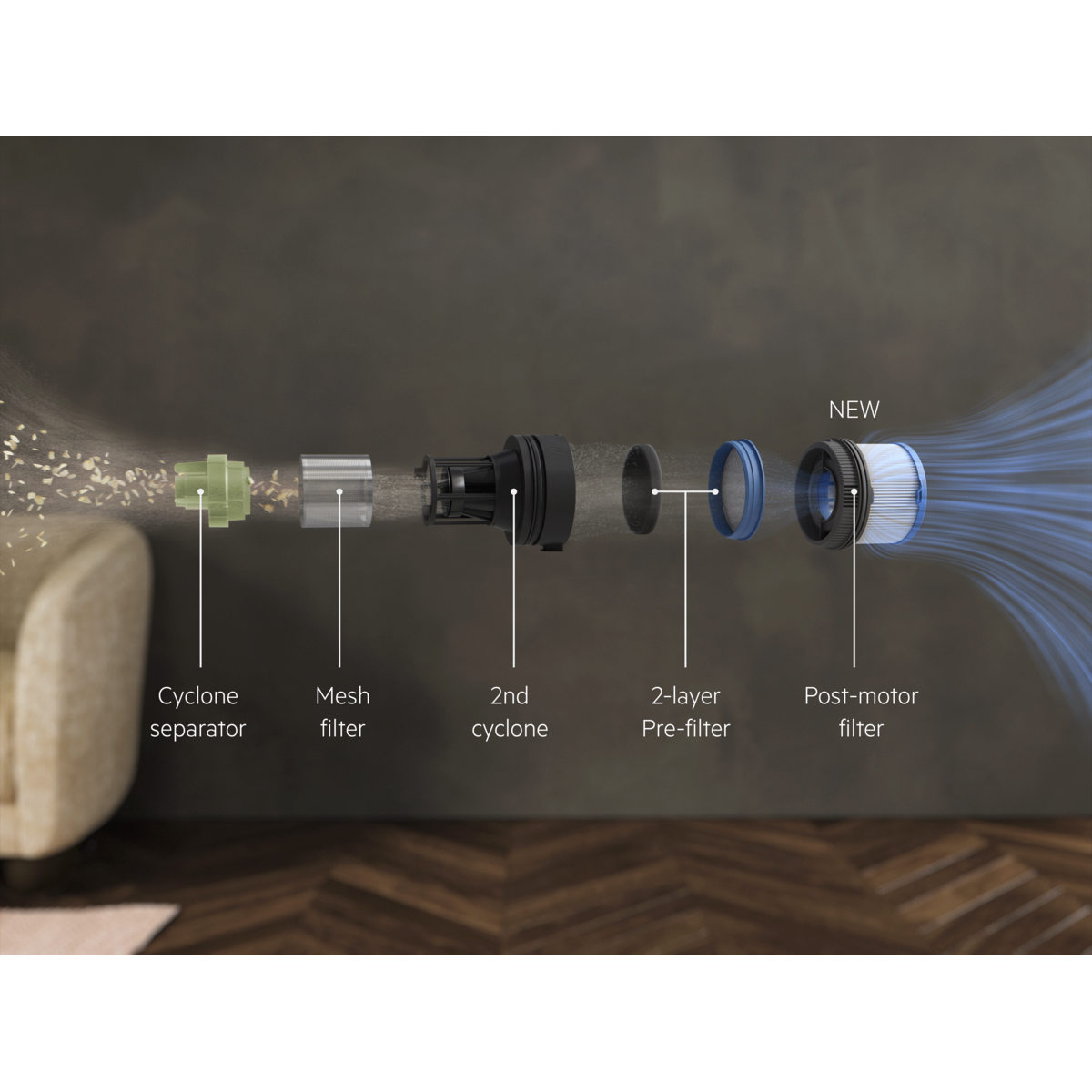 *Com base em teste interno segundo a norma IEC 62885-4.**Em comparação com motor de ciclone único em aspiradores sem fios.