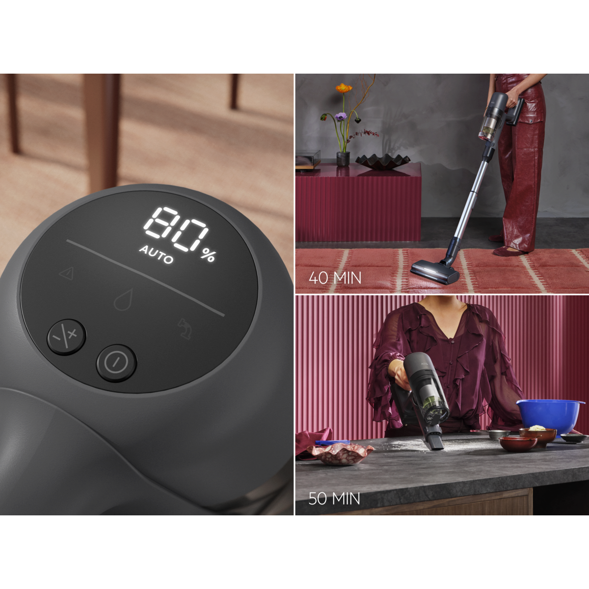 *Com base em testes internos segundo a norma IEC 62885-4, medindo o tempo de funcionamento da unidade manual e do aspirador completo. **Comparado com o tempo de funcionamento no modo Boost. ***Cobertura de limpeza com o aspirador completo, usando passagem dupla a uma velocidade de 0,5 m/s.