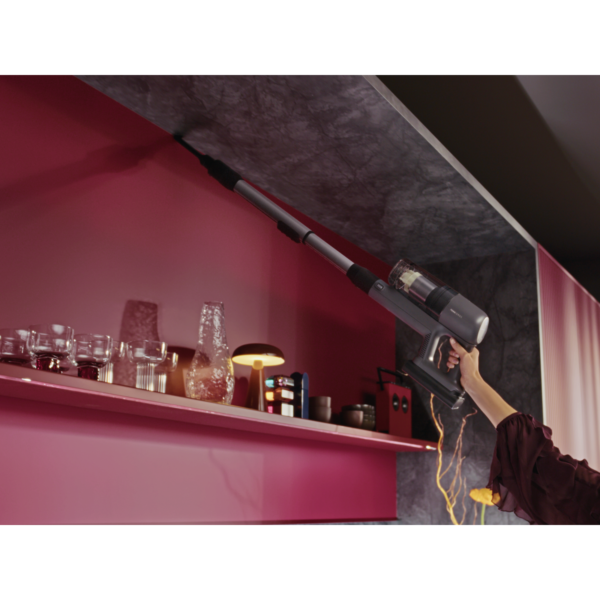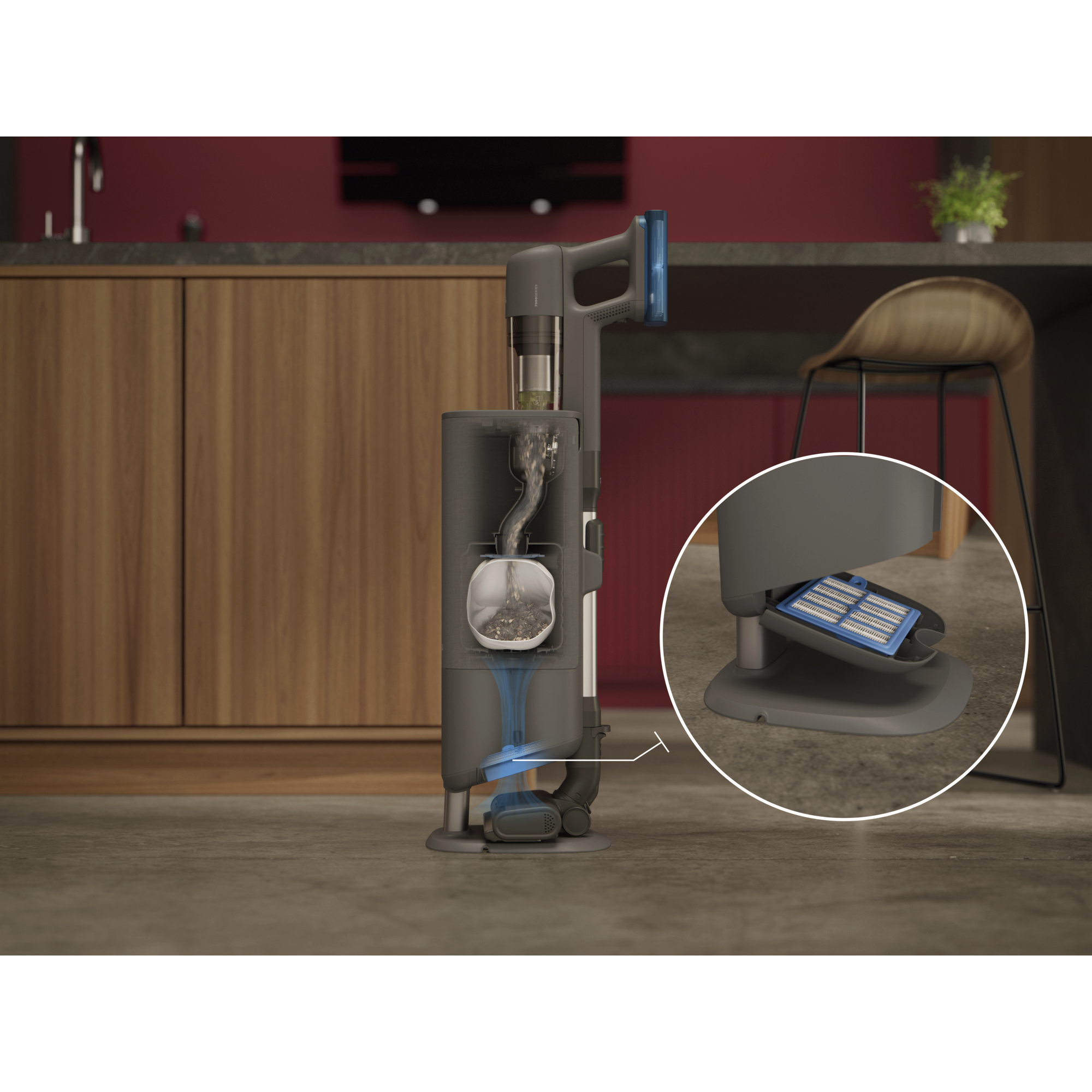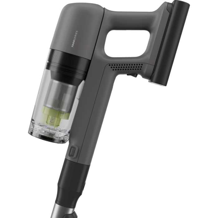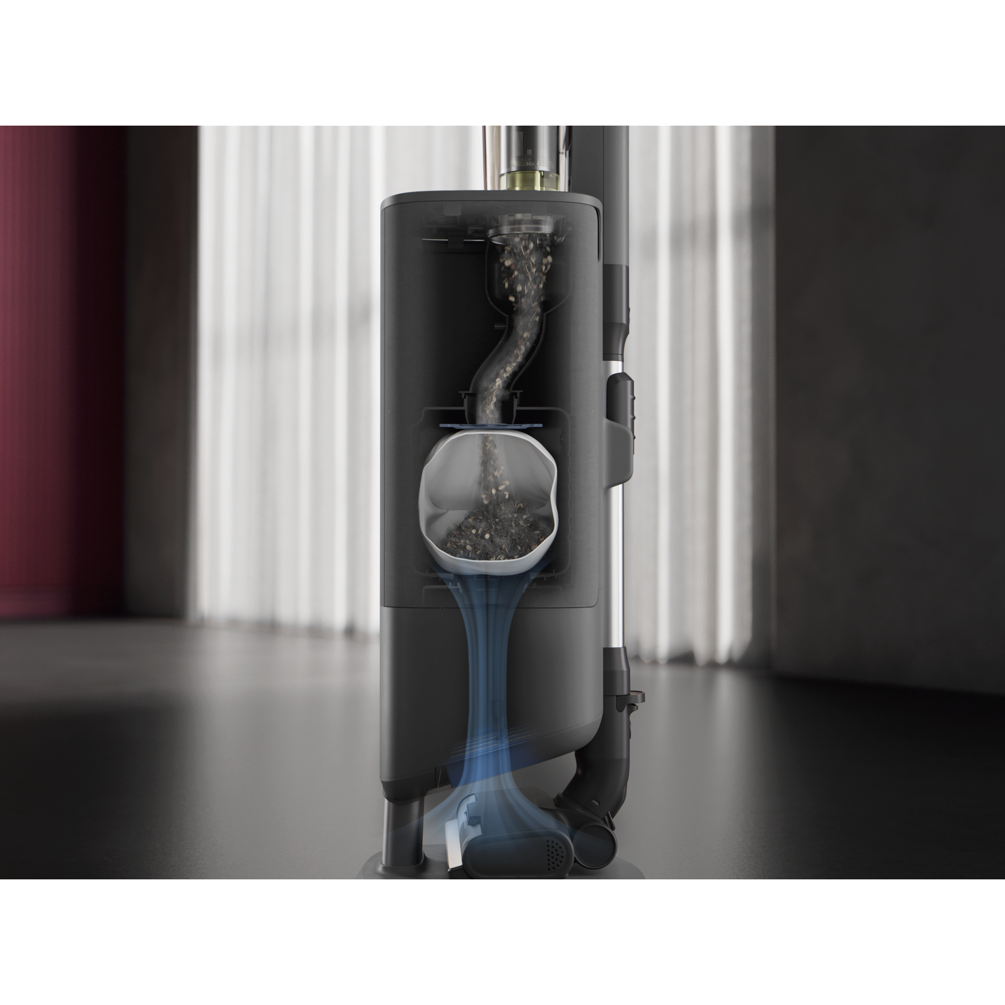 Aspirador vertical Série 7000, com estação de esvaziamento, bateria de 21,6 V, tempo de carregamento de 4,5 horas, autonomia de 9/20/40/50 minutos (3 velocidades), depósito com capacidade de 0,3 litros, escova AllFloor Multisuperfícies, 4 acessórios, escova BedProPower™, cinzento escuro