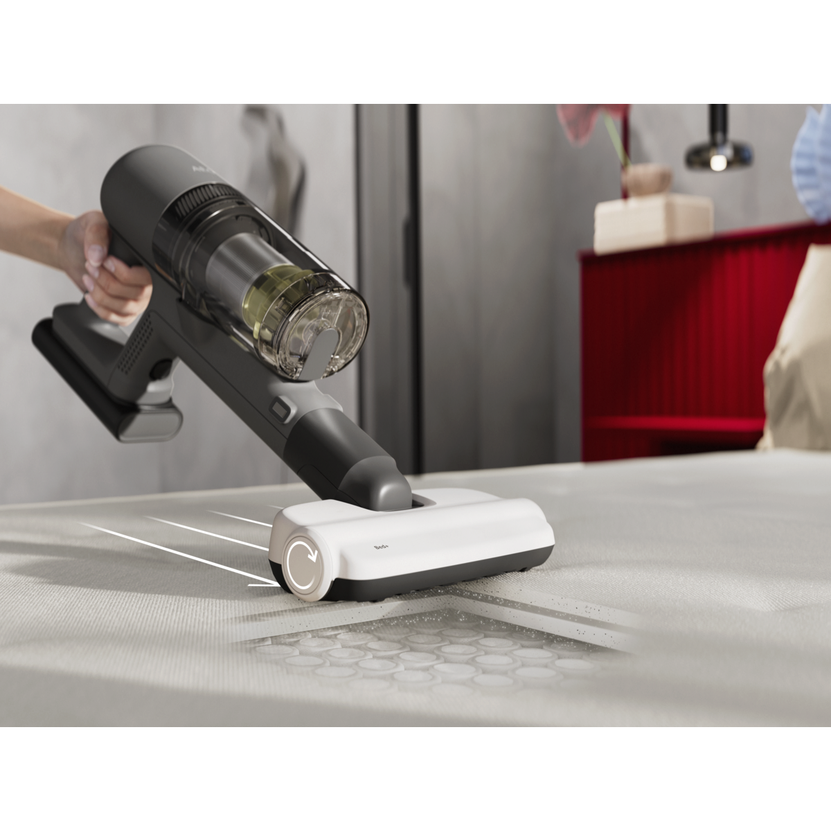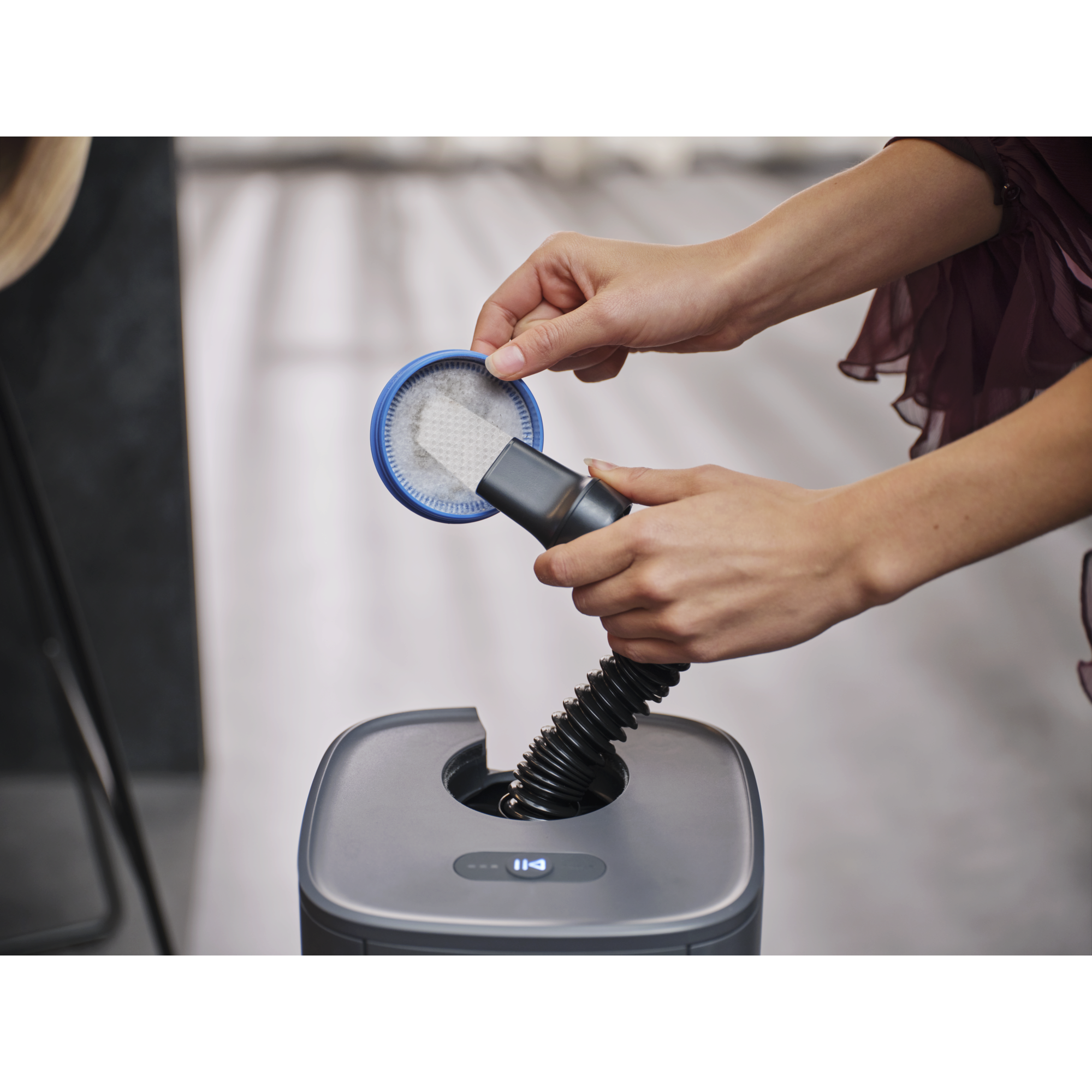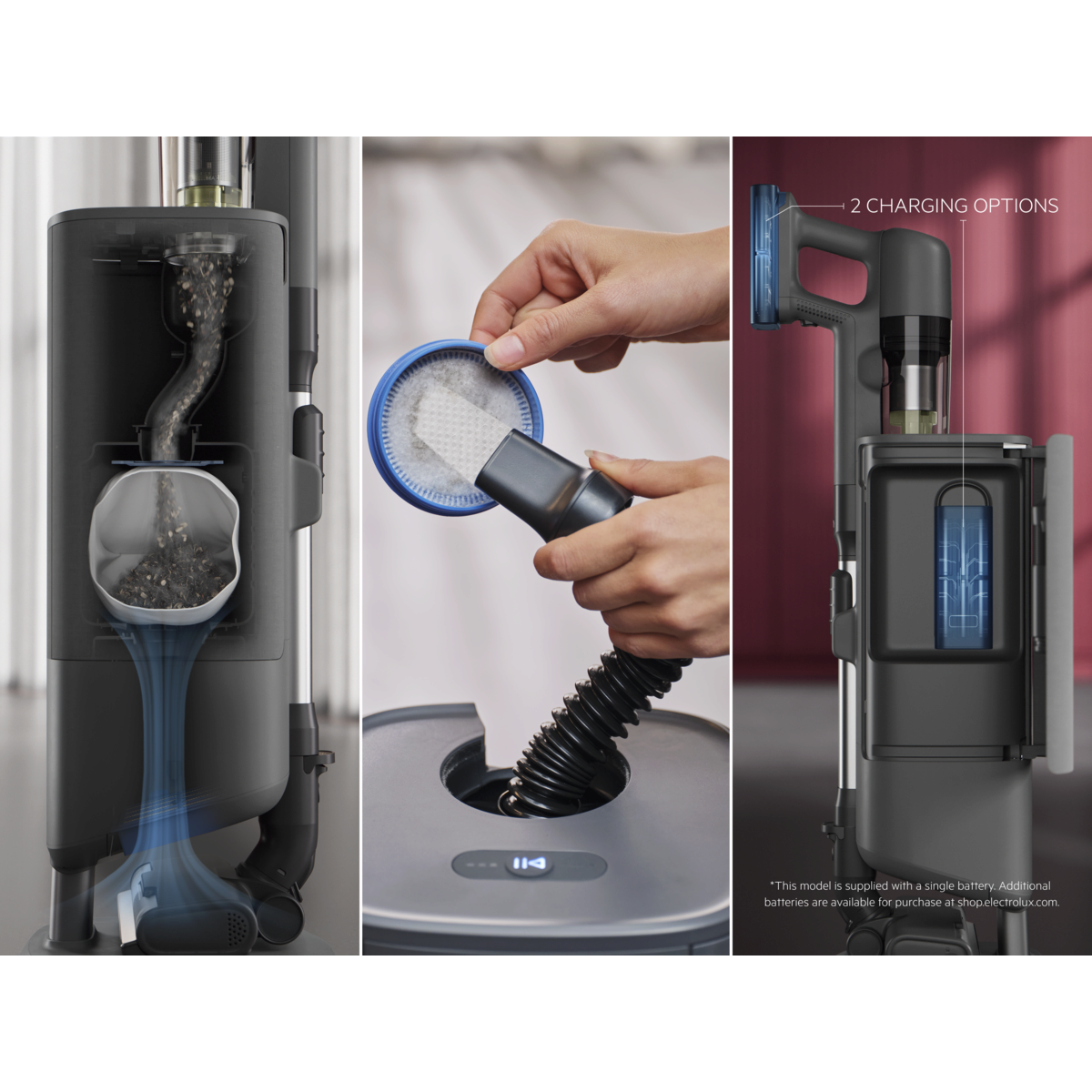 Aspirador vertical Série 7000, com estação de esvaziamento, bateria de 21,6 V, tempo de carregamento de 4,5 horas, autonomia de 9/20/40/50 minutos (3 velocidades), depósito com capacidade de 0,3 litros, escova AllFloor Multisuperfícies, 4 acessórios, escova BedProPower™, cinzento escuro