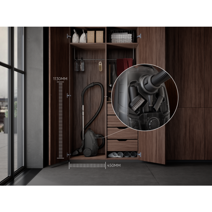 Aspirador sem saco com depósito de grande capacidade de 1,8 litros, potência de 750 W, escova coletor de pó, escova para pavimentos duros, escova multiusos para estofos e espaços estreitos, filtro higiénico lavável, nível de ruído, 80dB(A)