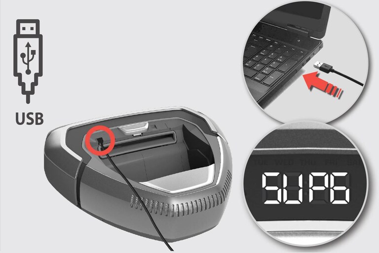 Passo 3Ligue o robot com um cabo micro USB ao seu computador. O computador reconhece o robot como um dispositivo de armazenamento em massa USB. O visor do robot exibirá "SUPG". (Certifique-se de que usa um cabo USB que não seja apenas para carregar, mas também para transferência de dados.)